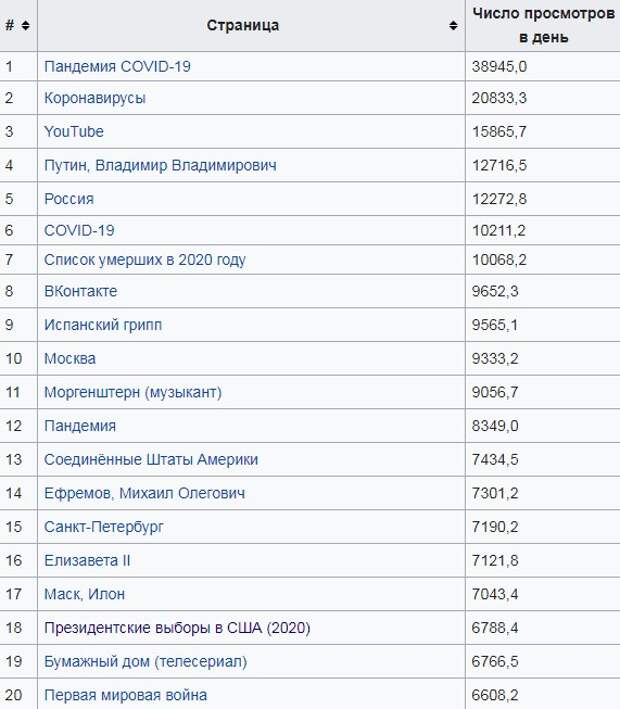 Самая популярная в интернете энциклопедия «Википедия» представила список 100 самых популярных статей на русском языке за 2020 год. Первое место у материала на тему «Пандемия COVID-19». Информацию об эпидемии просматривали в среднем 38945 раз в день. На следующей строчке статья на тему «Коронавирусы» – 20833 просмотра за сутки. Замыкает тройку самых популярных материалов статья, рассказывающая о платформе YouTube – 12 716 просмотров в день.