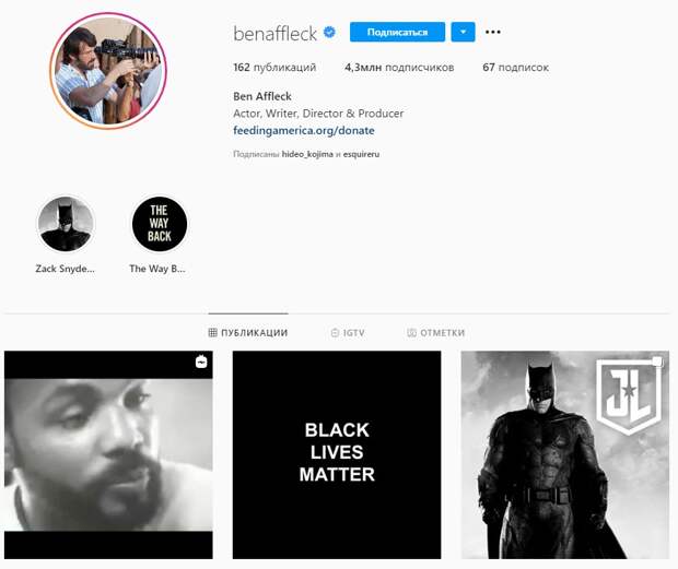 На аватарке профиля можно увидеть мужчину, очень похожего на Бена Аффлека. К тому же, в описании аккаунта указано имя Бен, а сам пользователь характеризует себя как «просто отца, который иногда делает фильмы». У пользователей сети почти не осталось сомнений, что это вторая страница актёра для своих.